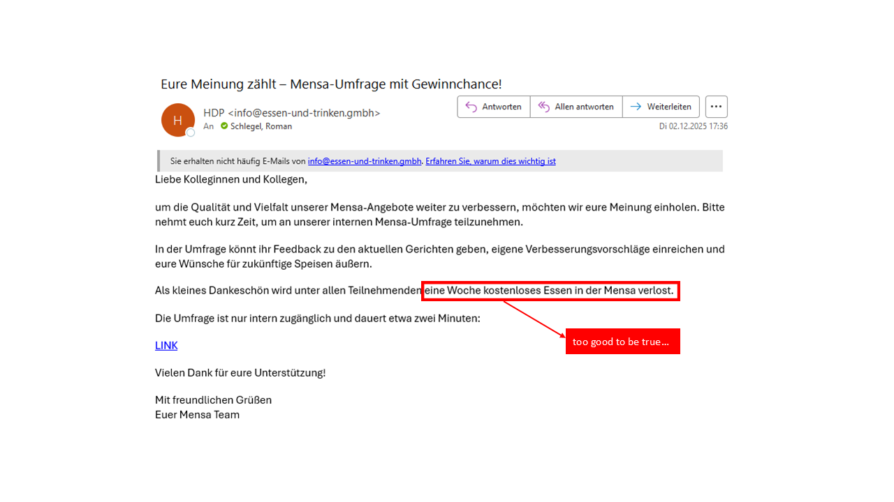 Bitte senden Sie künftig verdächtige Nachrichten an das Cybersecurity Team. Wir werden die Nachrichten prüfen und Ihnen mitteilen, ob diese bösartig waren oder nicht.